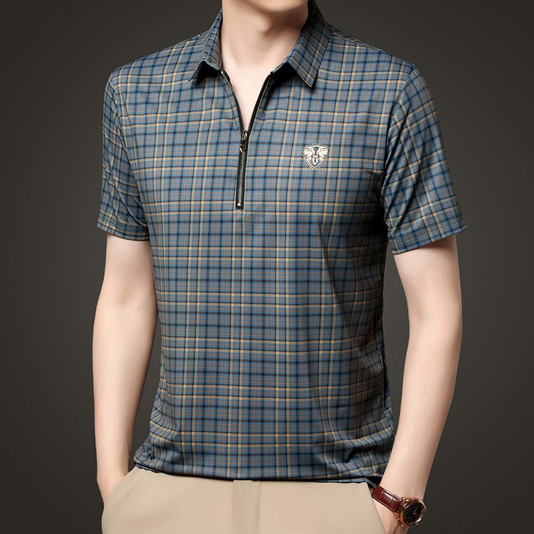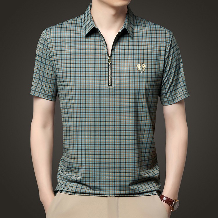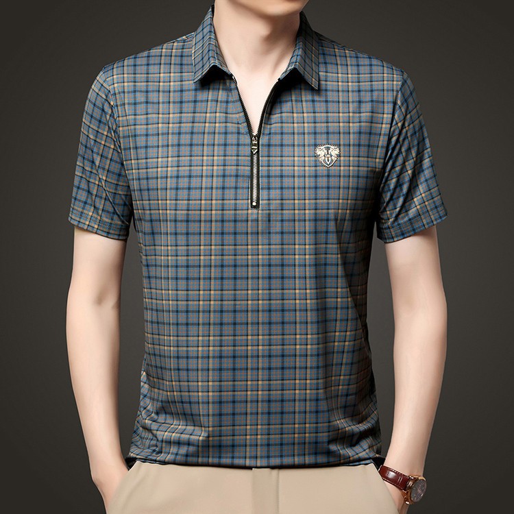 New Ice Silk Plaid Print Zipper POLO Short Sleeve T-Shirt(cm503)