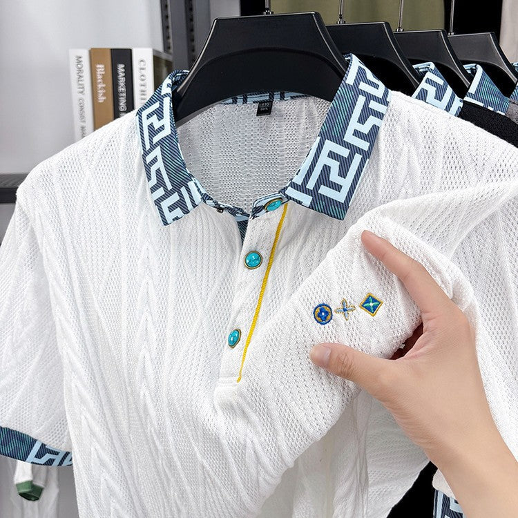 luu859- Men's Jacquard Embroidered Lapel Short Sleeve Polo Shirt